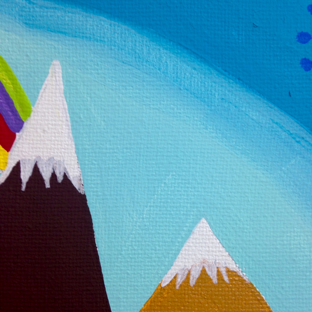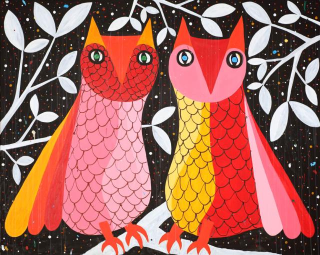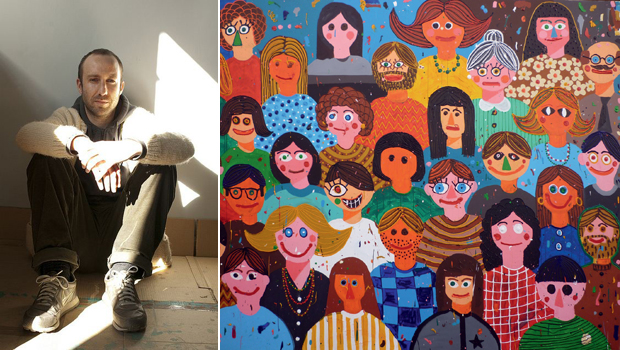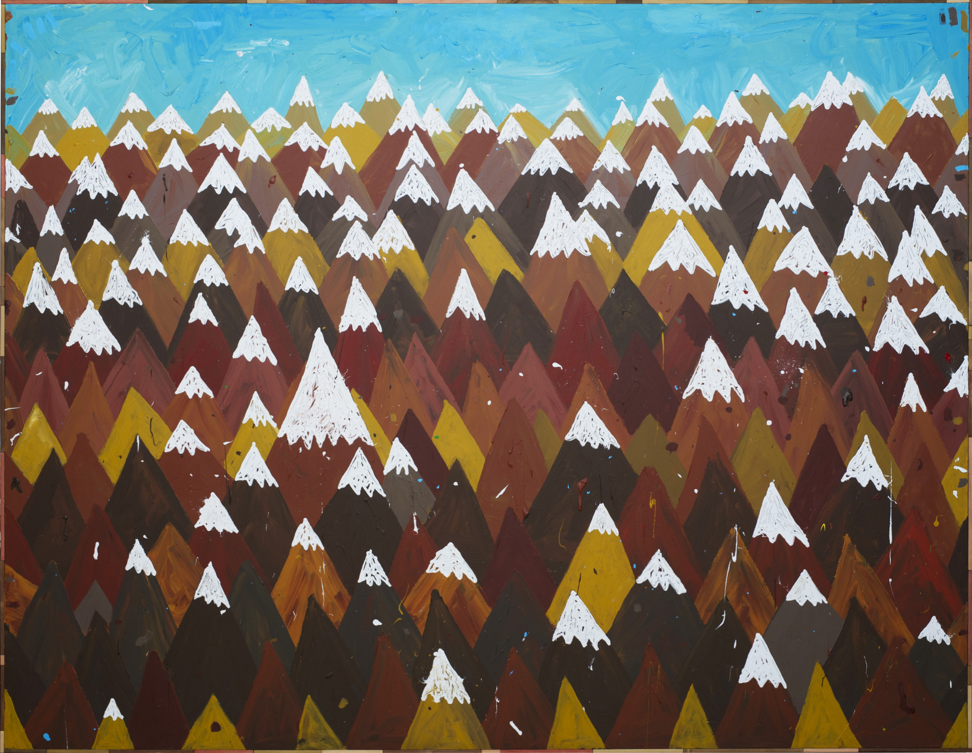 returning to the basics, often painting as a child, and even going as far as dedicating an entire week to only generating one type of image – for example scribbling triangles on his canvases for weeks, then dedicating another week to spreading dots over the works…the end results are works that can be seen as both abstract and figurative, real and surreal. Yet their bright colors and silly playfulness belie a darker side.