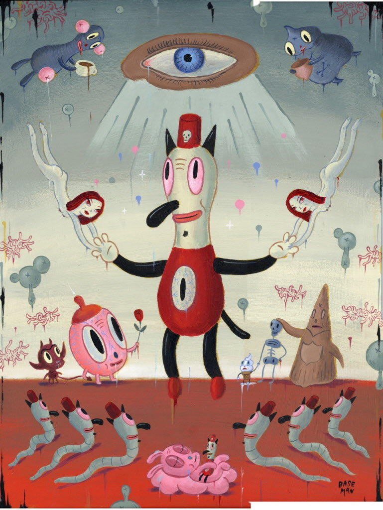 Baseman’s art is frequently associated with the lowbrow pop movement, also known as pop
