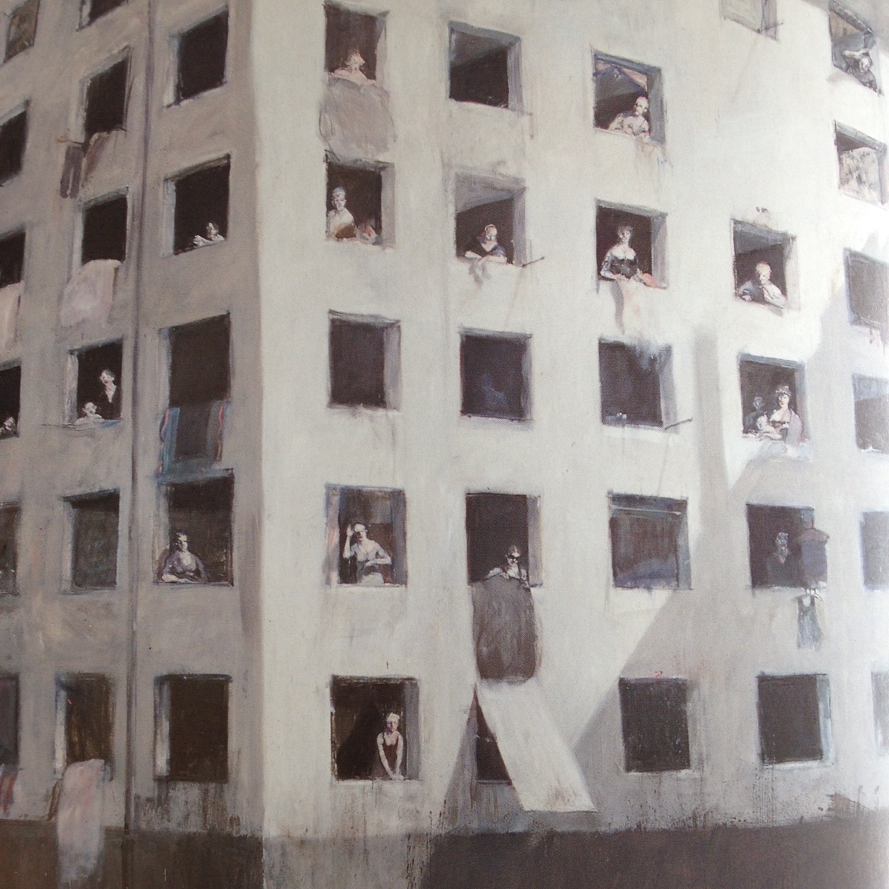 seems to map a kind of universal psychological terrain.  The searching characters at the center of this world, who carry on and look for meaning despite the oddness of their circumstances, serve as our allegorical stand-ins, so that ultimately these paintings portray not individuals but something larger and more tentative – the difficulties and tensions of being human.