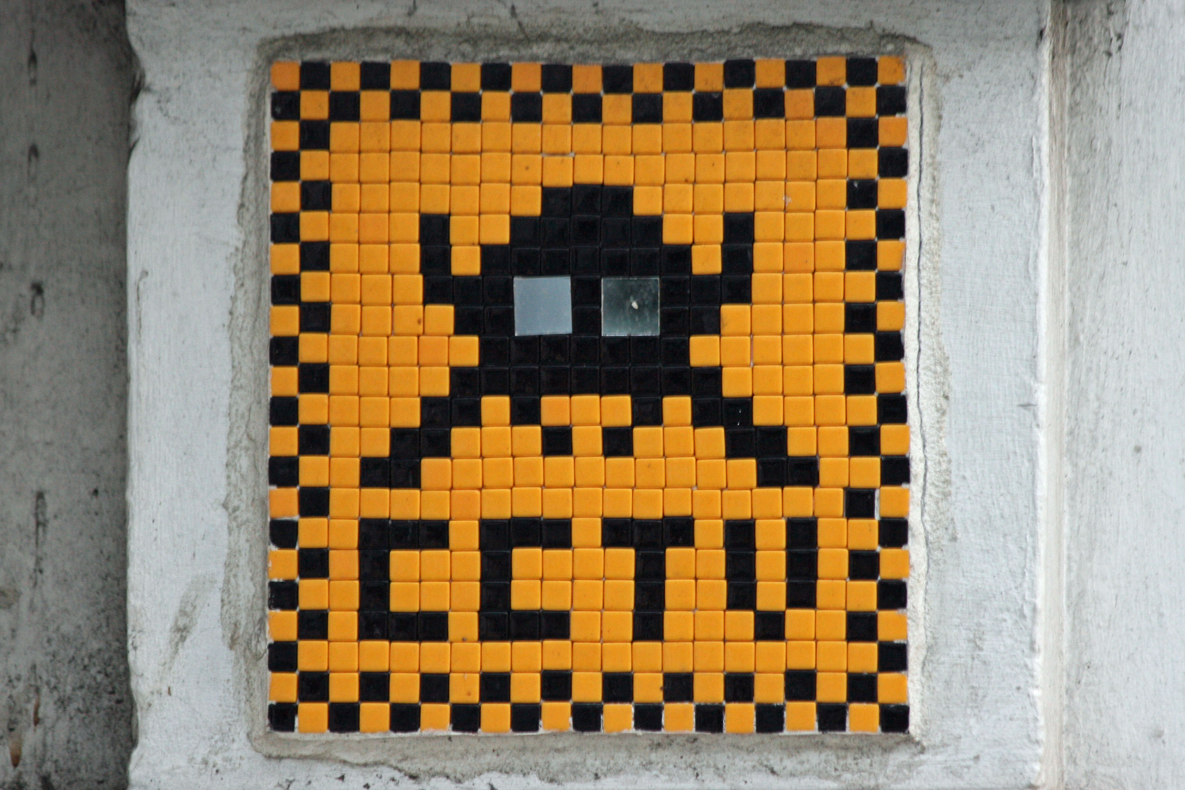 As a graduate of the École des Beaux-Arts, or Tiling School on Mars, Invader initially derived inspiration for his creations from video games from the late 1970s to early 1980s that he played when he was growing up, particularly characters from Space Invaders, from which he derived his work name. Games of the era were constructed with 8-bit graphics, and so lend themselves well to the mosaic treatment, with each tile representing one pixel. Invader likes tiles for their robustness and permanence. Invader’s first mosaic was installed in the mid 1990s in his home city. It was a sleeper for several years before the full “invasion” programme was conceived in 1996.