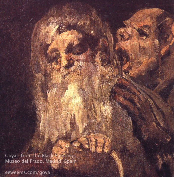 1819 to 1824 Goya lived in seclusion in a house outside Madrid. Free from court restrictions, he adopted an increasingly personal style. In the Black Paintings, executed on the walls of his house, Goya gave expression to his darkest visions. A similar nightmarish quality haunts the satirical Disparates, a series of etchings also called Proverbios.