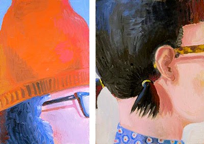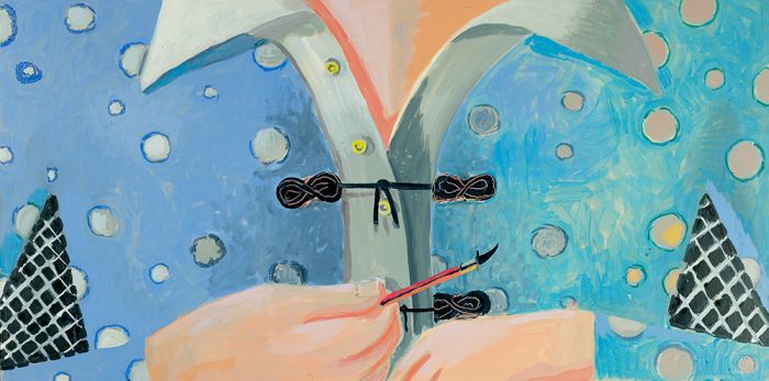 She aims to invest the paintings with the real weight of experience, but keep the figures emblematic. A character in Sisto’s world is a persona rather than a person. Her content-development process fluctuates between the pop culture/social (signified by the abstracted language of cartoon) and the personal (signified by elements of realism). There’s a touch of cubism as well. She finds an interiority through fracturing and simultaneity, seeking to avoid using a specific narrative to spell things out.