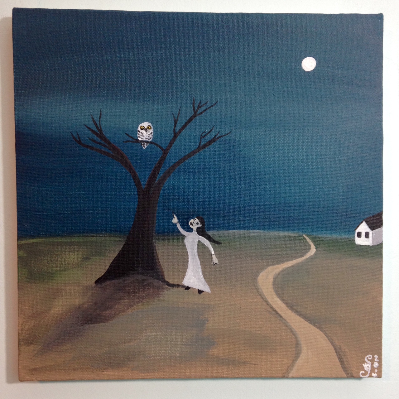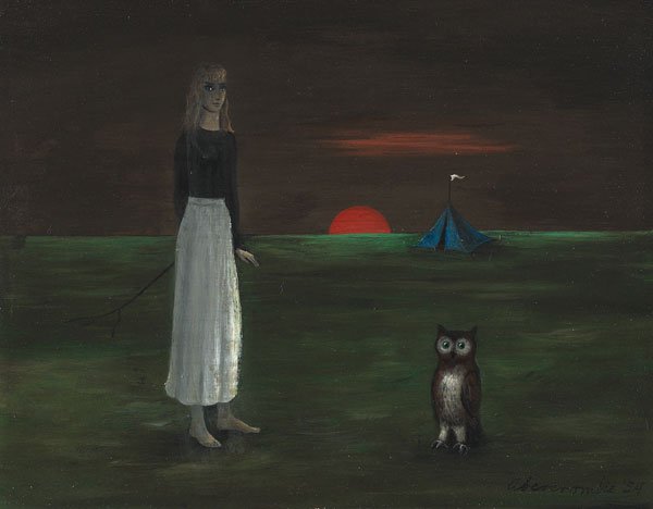 compositions feature a lone woman in a flowing gown, often depicted with attributes of sorcery: an owl, a black cat, a crystal ball, or a broomstick. These works were often self-portraits, as she stated in an interview with Studs Terkel shortly before her death: “it is always myself that I paint”. Tall and sharp-featured, she considered herself ugly; in life she sometimes wore a pointed velvet hat to accentuate her witch-like appearance, “enjoy[ing] the power this artifice gave her over others who would fear or recoil from her”. The 1940s and ’50s are described as her most prolific and productive period; a time when she no longer painted many portraits, but retained the themes mentioned above.