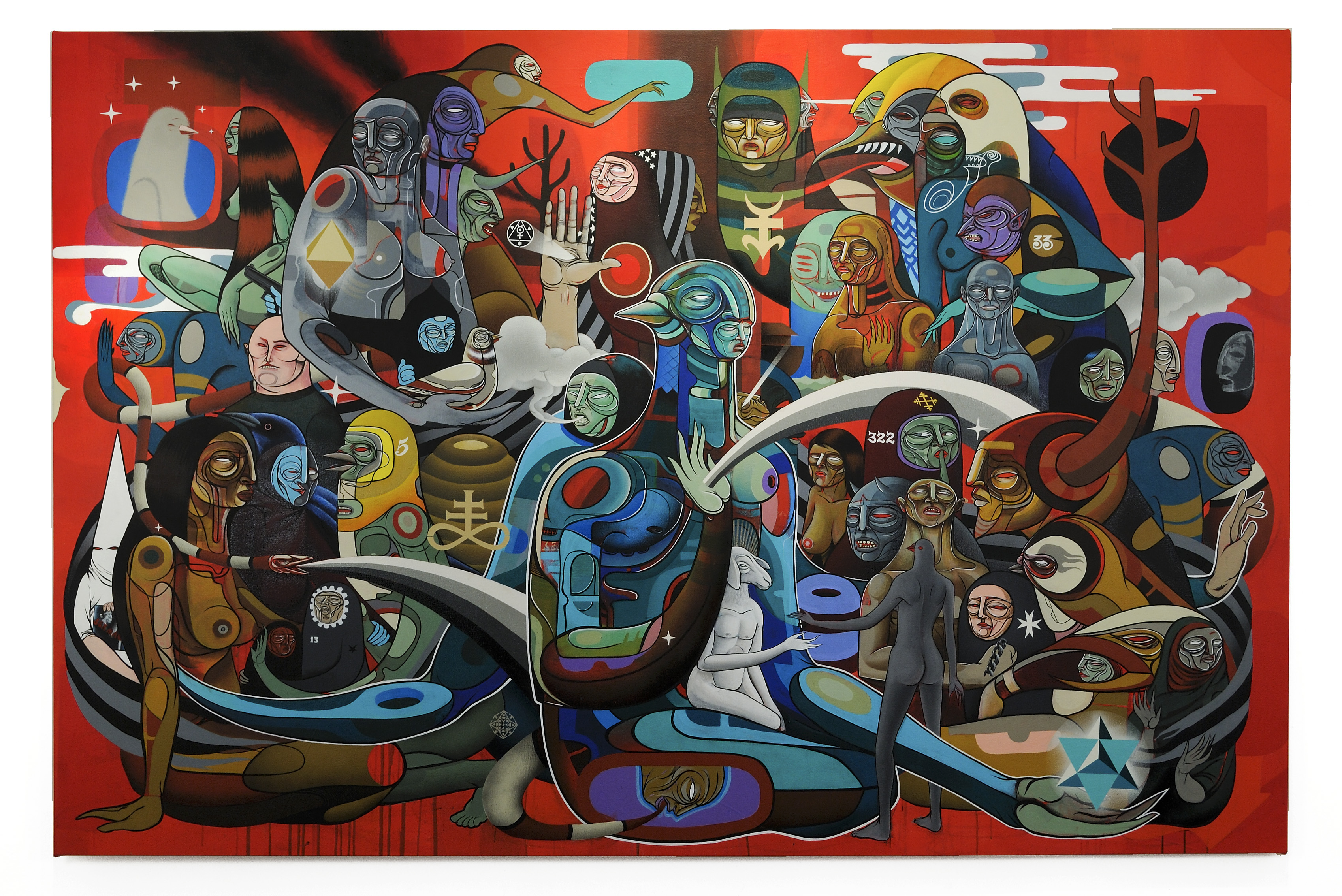 Through stream-of-consciousness painting, Doze Green creates fractured imagery to convey infinite possibilities. His intention is to reveal works with an ever-changing narrative. Multi-dimensional planes and illusion of time are presented through fragmented, incomplete figures.