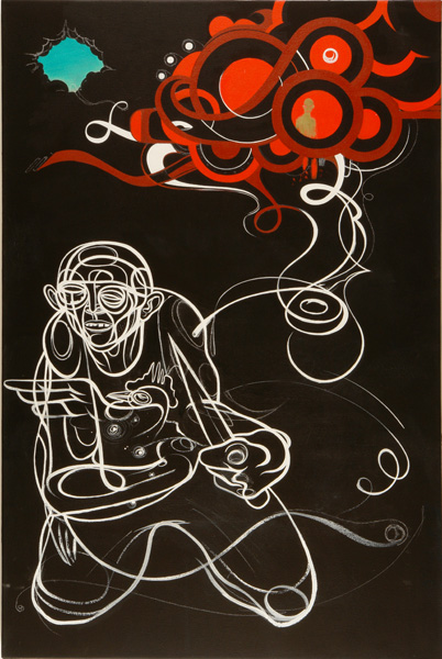 Doze Green translates complex metaphysical concepts through his paintings, such as the possible manipulation of energy and matter to create a timeless space. He explores meditations on matter and anti-matter, layers of consciousness, and different possibilities based on cosmology.