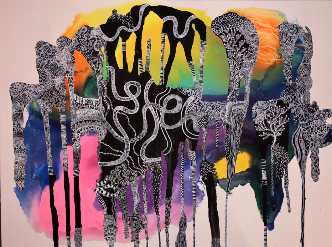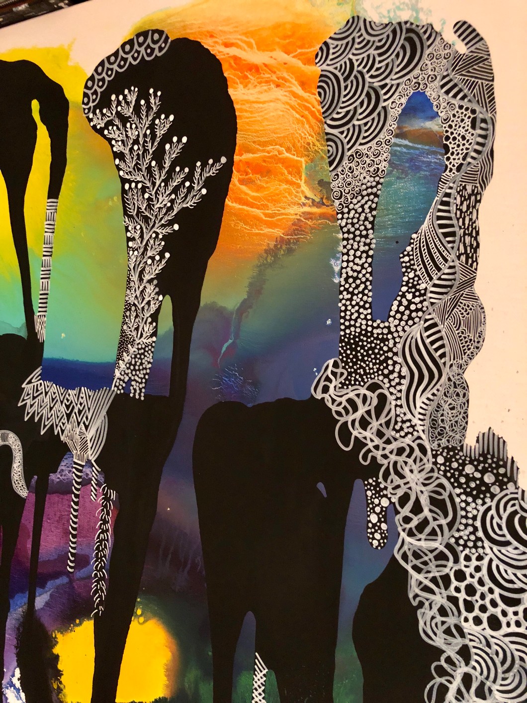 A friend asked me to do a commission piece. She really liked my alcohol ink pieces but wanted something big (3×4 feet!). I didn’t think I could do a piece that big in that medium (now I realize I can get huge rolls of yupo paper!). So I told her I’d try to emulate it with acrylics. I’m SO glad I did because it’s turning out great and I think I’ll be doing more like this. I’m going to keep creating alcohol ink paintings in smaller format for now. 😉 here’s how the piece is turning out!